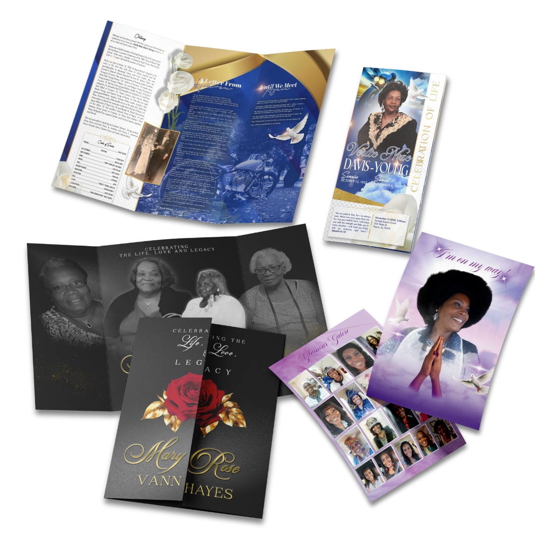 At 5SDP, we specialize in creating beautifully designed funeral programs, memorial keepsakes, and custom tributes that honor your loved ones with dignity and care. Our team is here to help you craft a personalized tribute that reflects their unique life and legacy.